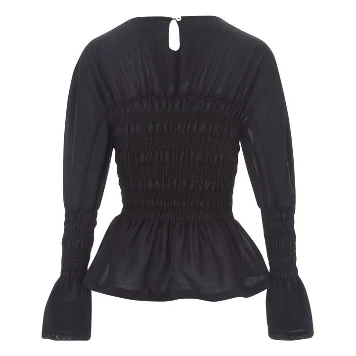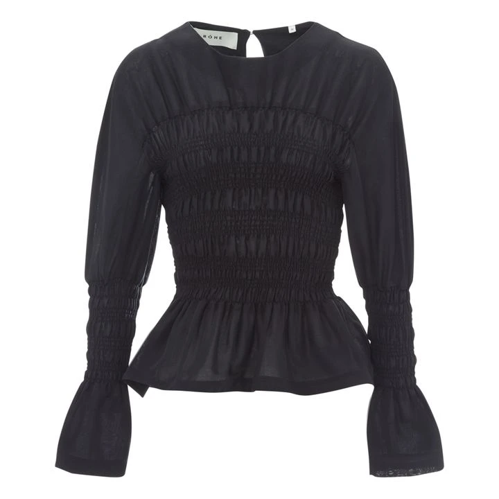 - Bell sleeves, Ruched, Smock chest, Low armholes, Crew neck, Balloon sleeves, Long sleeves, Smocked cuffs