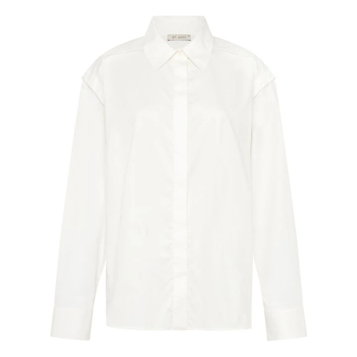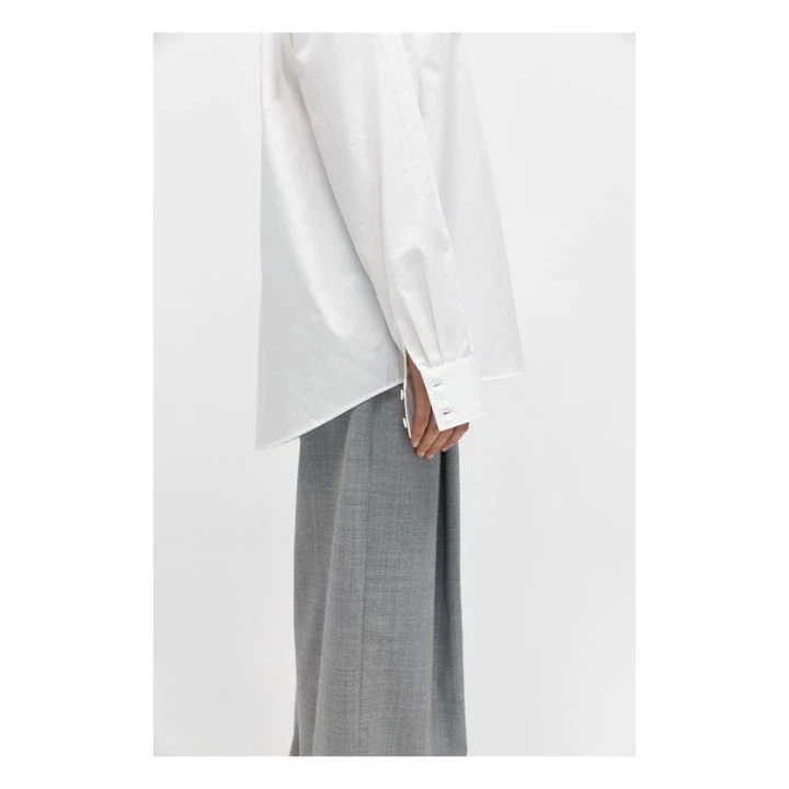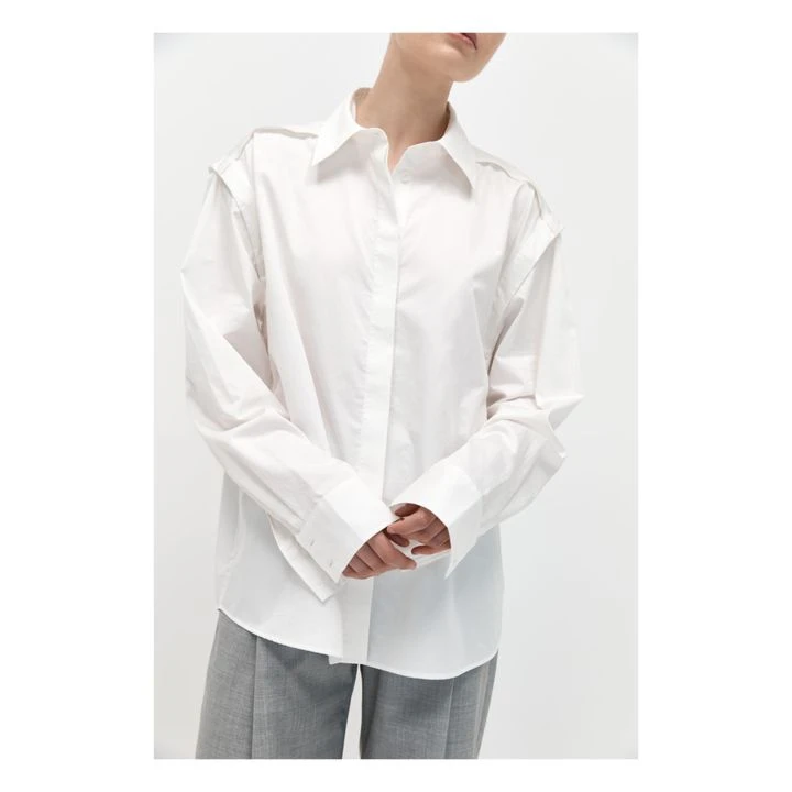 - Bell sleeves, Classic collar, Low armholes, Removable sleeves, Longer at the back, Buttoned cuffs